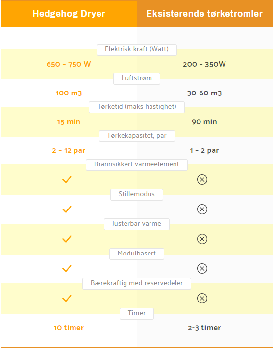 Tørker de fleste gjenstander på 15 minutter. Våte løpesko på under 10 minutter med vår patenterte turbinteknologi.